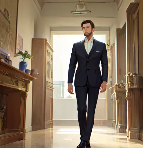 豪邸の廊下を歩いているスーツイケメンの2次元画像、髭面でとてもダンディな男性、ここの家の住人だとしたらかなりお金持ち