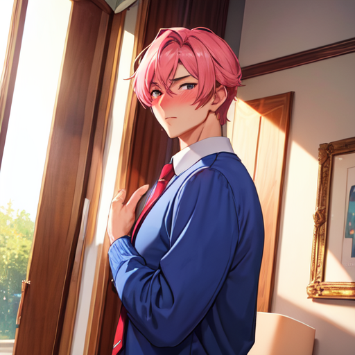ピンク髪で女の子みたいにかわいらしい顔の男子がはずかしそうに赤面している萌え系イラスト画像